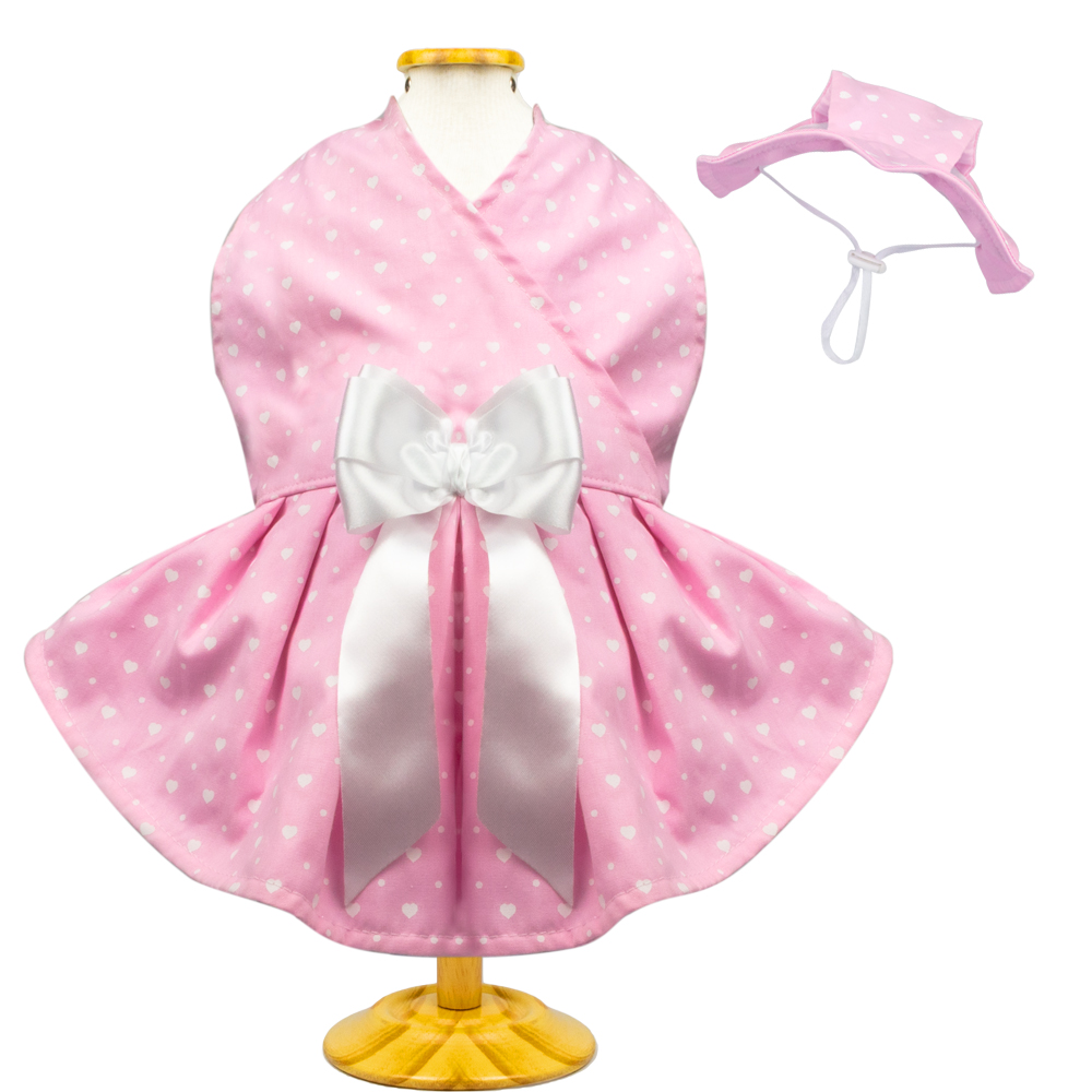 Detalhes em laço em cetim, fechamento com velcro e chapéu com regulagem.